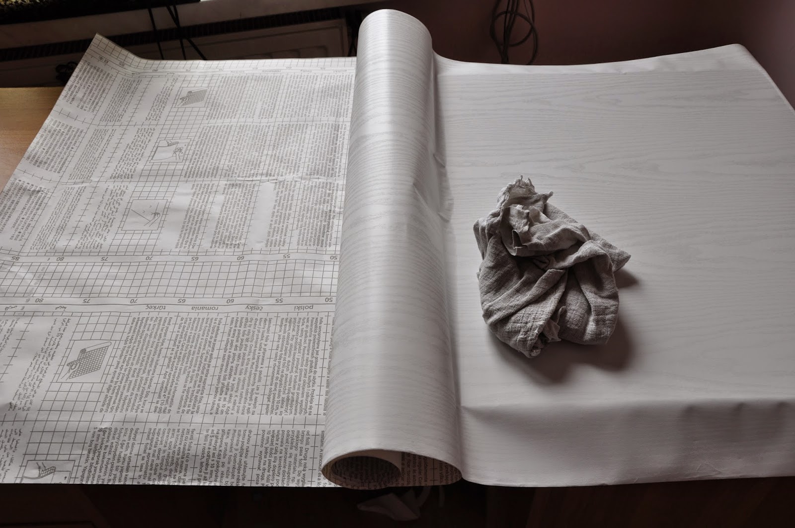 Po delikatnym przeszlifowaniu i przetarciu benzyną ekstrakcyjną na blat przykleiłam okleinę drewnopodobną w kolorze białym. Cenne wskazówki znalazłam na blogu Stara Winiarnia